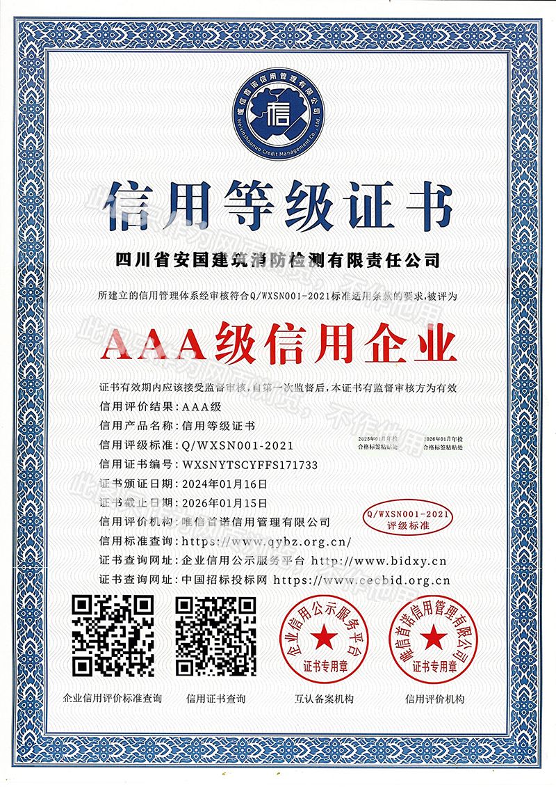 四川省安國建筑消防檢測有限責(zé)任公司,成立于1998年,經(jīng)四川省公安消防總隊(duì)批準(zhǔn),工商部門注冊(cè)的獨(dú)立法人單位。